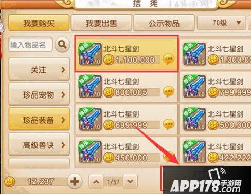 2、点摆摊,然后逛摊子,看到想买但还没钱买,或者犹豫的先关注吧。如下图,选中装备再点关注。