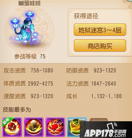 推荐理由:作为参战等级为75的召唤兽,成长上肯定略胜一筹,幽莹娃娃的综合资质也是不可多得,出色的法资,不俗防资质和体资都让她成为了法宠炼妖首选;技能里第一无二的高级魔之心加固了她在法宠界的地位,而且自带一个大法:泰山压顶,真是技多不压身。说到这里,我来为大家列出法系技能,以供参考。