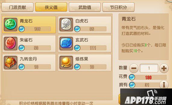 大家也看到下面的小字了。。价格是会根据系统数据变动的~怕换亏的朋友注意先观察两天价格区间反正侠义是不会减少的。。小编在换了几次青龙石打装备过后,个人认为人品这个东西真不好说(每个人不一样哈哈哈)所以后来侠义值都是换修炼果子和金丹了、。。。换石头打武器真是血本无归啊有木有!!!!!