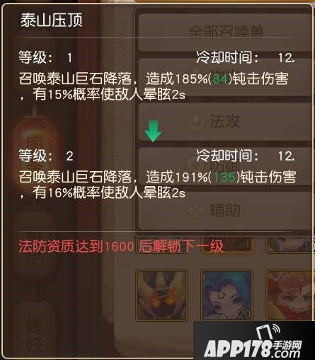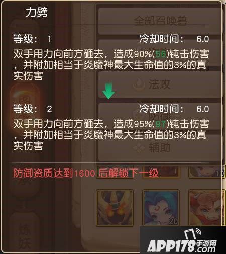 可能有的同学想问了,召唤兽的技能要怎么提升,在下面的图中可以看到,炎魔神的防御资质提升到1600就可以解锁力劈技能的下一级,所以在资质培养的同时,还可以提升召唤兽的技能等级,所以我们要优先提升会影响技能等级的资质!
