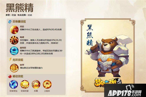 1、黑熊精:黑熊精拥有不俗的防御能力,而且咆哮技能(发狂嚎叫,使敌人无法移动并造成伤害,同时提高自身攻击力,持续一定时间。)