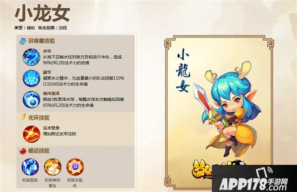 2、小龙女:奶妈,目前游戏中比较不错的奶妈,能给队伍中血量最少的人物进行单体加血,奶足够的话可用竞技场。