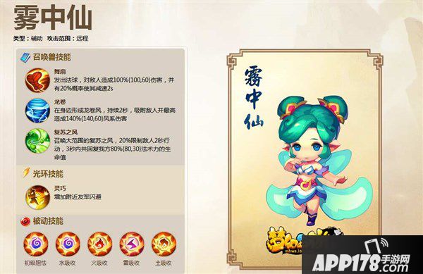 3、雾中仙:技能舞扇(发出法球,对敌人造成伤害,并有概率使其减速)能降低地方速度,让本来就有速度优势的杀破狼能更如意的放风筝。而且其复苏之风技能也具有回复能力。