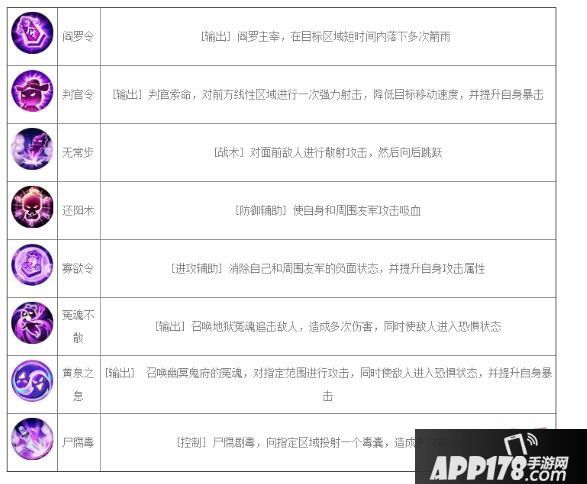 从图上可以看到杀破狼的技能一共有8个技能,有控制类、输出类、状态类、被动等等。主要输出有4个技能阎罗令,判官令,冤魂不散,黄泉之息。前期在没有冤魂不散和黄泉之息的情况下主要刷图的输出技能就是阎罗令和判官令,阎罗令是群伤技能清理小怪很好用。判官令又有输出又有控制还有位移(刷图PK都很好用,必带技能之一)。刷普通日常副本的时候建议带上全输出技能刷的快些,因为杀破狼本身就一个远程的角色,稍微走A躲伤害基本不掉血。像刷精英副本幻境之类的就要带上一些控制和状态技能建议还阳术 寡欲令 攻击技能的建议判官令 阎罗令 黄泉之息。