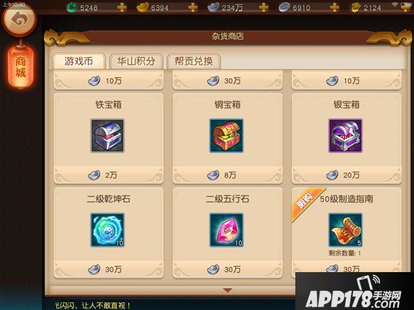 1.商店银币购买:二级乾坤石×10=30W银币 二级五行石×10=30W银币 三级乾坤石×10=90W银币 三级五行石×10=90W银币