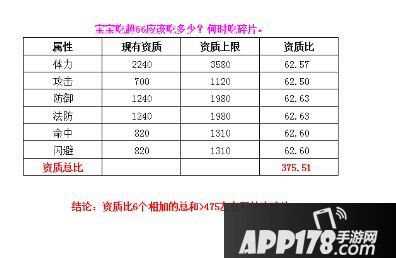 每个宝宝根据吃超66随机给的增长资质不同,其实并不是固定的去吃多少超66。我做了一个实验,给一个宝宝吃260个超66,和吃500个超66,最终效果相差无几。有时候吃300个反而比吃280个所提升的总资质还要低。