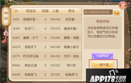 同样为打开“帮派”界面栏,在左侧列表中会显示已经创立的帮派名称并按照帮派规模为优先级排列,玩家可以选定自己希望加入的帮派在右侧点击申请按钮,这样该帮派的管理人员就可以在申请列表中批准你加入了。当然,如果觉得麻烦,也可以选择右侧的一件申请按钮,点击后将会向所有帮派申请。