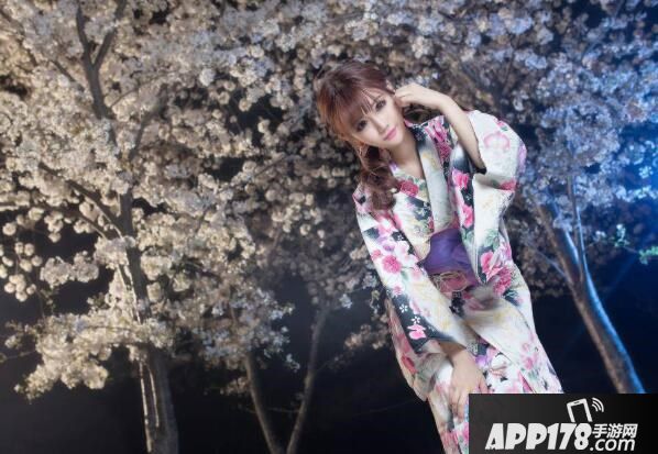 身着和风服饰站在樱花树下,场景美轮美奂。
