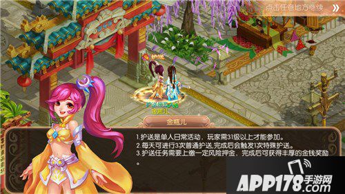 玩家等级达到31级后即可解锁护送任务,护送任务是单人任务,接取任务需要抵押一定的银币,护送NPC到达指定地点后即可获得丰厚的银币奖励。玩家每天可以完成3次普通护送任务,完成第3次护送任务后有概率触发额外护送任务,平均每次护送任务能够赚取十几万银币。