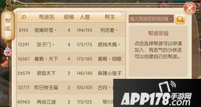 同样为打开“帮派”界面栏,在左侧列表中会显示已经创立的帮派名称并按照帮派规模为优先级排列,玩家可以选定自己希望加入的帮派在右侧点击申请按钮,这样该帮派的管理人员就可以在申请列表中批准你加入了。当然,如果觉得麻烦,也可以选择右侧的一件申请按钮,点击后将会向所有帮派申请。