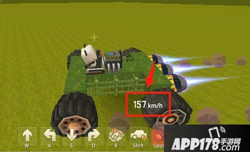 按下推进器按钮推进器会喷射火焰,大幅提升载具的速度!达到157km/h,速度增加了一倍之多,需要注意的是:推进器是会过热的,长时间使用后需要等待冷却后才可以继续使用。