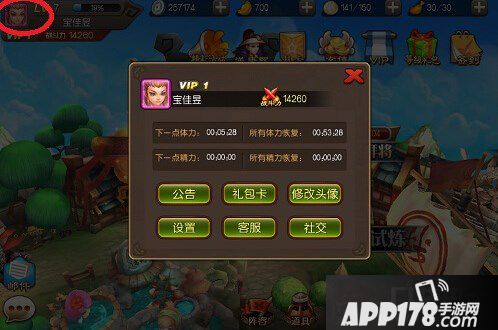 点击左上角主角人物头像,这里可以查看游戏内的公告,时刻掌握游戏最新动态,礼包领取,设置游戏声音,音效。同时遇到问题可以直接在此联系客服为你解答,社交中玩家可寻找好友,如遇到刷广告的可将其拉入黑名单。体力精力的回复时间也可以在这里查看。