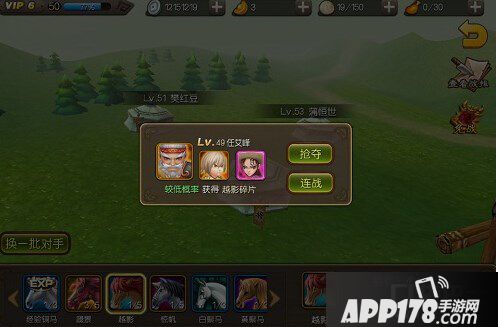 选择战马抢夺,进去之后点击下方想要搜集的战马碎片,然后在点击其他玩家的帐篷对其进行战马碎片的抢夺,抢夺战力低的玩家可使用连战,系统会自动对其进行连续抢夺,直到抢到该战马碎片才停止,但是获得碎片概率较低。连战默认次数为10次,如果抢夺战力较高的玩家,那么获得碎片概率就较高,不过需与其正面战斗并且获得胜利才行,不能使用连战。当凑齐碎片后点击合成就可获得完整的战马了。越高级的战马碎片,获得的概率越低。丙级战马和经验马所需要的碎片是3个,乙级战马所需要的碎片是5个,而甲级战马需要8个碎片才能合成。