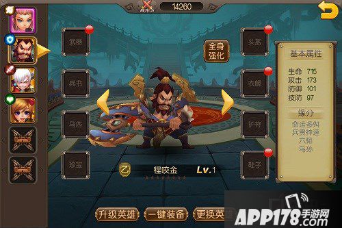 阵容:点击阵容红点代表你拥有的装备,点击一键装备可全部穿上。英雄下方可以看到升级英雄,一键装备,更换英雄,技能详情。点击更换英雄可替换当前英雄,选择你期望的英雄上阵。打开技能详情,可升级该英雄技能,升级技能消耗银两,随着英雄等级的升高,可提升的技能等级也会升高。