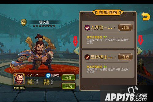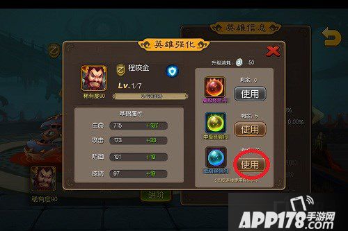 点击技能详情两边的箭头可翻转界面查看英雄信息,如详细属性,天赋,英雄传记,以及英雄的缘分。点击进阶需消耗进阶令和银两,以此解锁该英雄天赋,进阶到加3后需要进阶令和另一个相同的英雄才能继续进阶。这里的强化和前面的升级英雄是一样的,打开后可使用高,中,低级三种经验丹提升英雄等级,使用经验丹时按住使用不动,可快速使用经验丹升级,不用一下一下点使用这么麻烦。升级英雄一样要消耗银两哦。