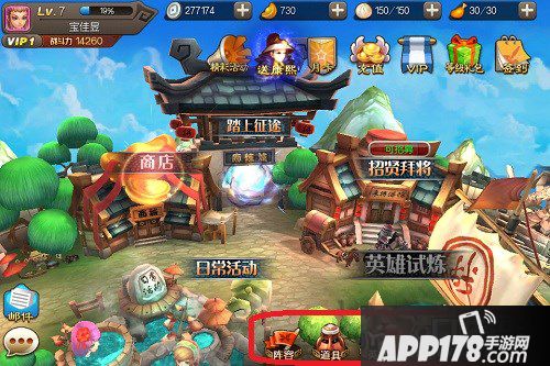 游戏内常用功能显示在下方,依次是阵容,道具,英雄,装备,任务,绝技。