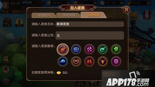 游戏界面中最左边建筑就是家族了,一个让大家齐聚一堂把酒言欢的乐园,打开家族可选择创建或者加入一个家族,每一个创建家族的族长都可以选择一个族徽,创建家族需要消耗500元宝,家族创建好后,其他成员可申请加入,享受家族的各种福利哦。