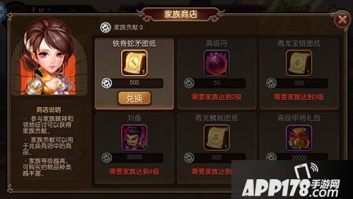 家族商店可兑换的东西很多,但是需要家族达到相对应的等级才可以开启可兑换的物品,例如家族达到四级,成员可用35000家族贡献兑换甲级英雄刘备。家族达到6级可兑换甲级英雄貂蝉,7级可兑换名驹精魄,和万卷精魄,则两种精魄可快速提升兵书战马等级。贡献和通过领地征讨,家族膜拜等获得。