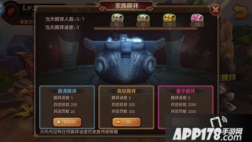 家族膜拜分为普通,高级,豪华膜拜,每一种膜拜可获得的家族经验不同,所消耗银两或是元宝数量也不同。每天膜拜的人越多,膜拜进度越高,同时成员获得的进度奖励宝箱越丰厚。家族每天只可膜拜一次,如30天没有任何膜拜进度的家族将会被自动解散。其中兵团经验和兵团贡献就是家族经验和个人家族贡献。