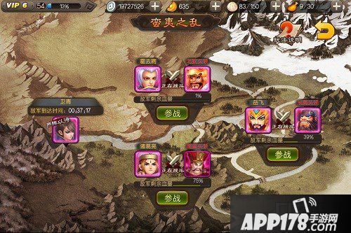 蛮夷之乱是每日的日常任务之一,通过协助霍去病,岳飞,诸葛亮,卫青击杀四个不同时间出现的蛮夷头领而获得奖励,北狄(10点出现)东夷(12点)南蛮(14点)西戎(16点)。每个玩家每天拥有五次进攻机会,可根据自身时间选择攻击适合自己时间点的蛮夷头领。