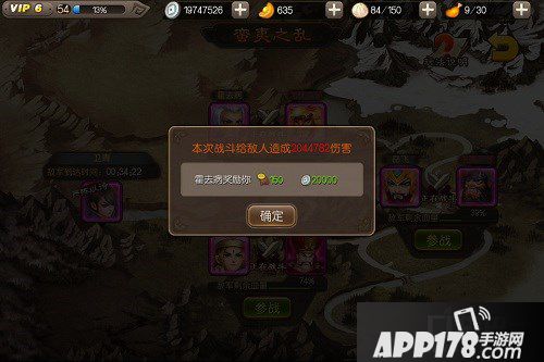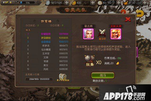 选择头领点击参战,进入与该头领战斗,如果本身战力不高,想获得更好伤害排行名次,可选择鼓舞来提高对蛮夷头领的伤害加成。鼓舞需消耗元宝。