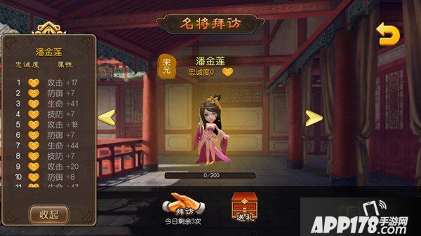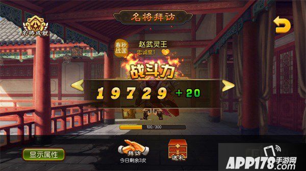 日常活动之名将拜访中,可拜访上阵英雄,增加好感度,提高英雄忠诚度等级,激活相对应的属性,大大提升英雄的攻击,防御,生命,技防。每天可以摆放所有的英雄累计不超过3次。还可给英雄送礼,大大增加忠诚度,赠送不同的礼物可以增加的忠诚度各有不同。