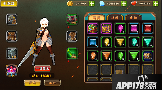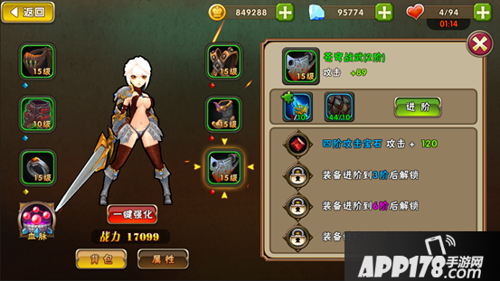 为了避免升级装备的操作过于繁杂,我们加入了一键强化的按钮,只要你有足够的金币和强化石就可以瞬间将装备强化到最高等级了。因为进阶需要的装备碎片不同,所以不可以一键进阶哦。