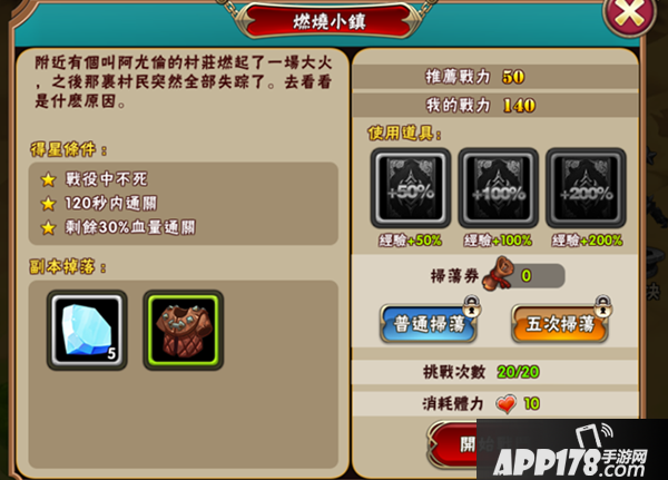 点开副本后,我们可以看此关卡发生的故事,魔女的主线剧情都是连接着战役上的故事,还有得星条件,星数达到宝箱中的打开次数后宝箱会闪闪发光,点开宝箱后可以领取各种钻石强化石材料等等奖励,前期的得星条件较为简单,后期在得星条件比较苛刻时,我们就需要努力提升战斗力,尽量达到副本中推荐战斗力再去挑战获得三星。每个副本的挑战一次可使用经验卡提升本次战斗获得的经验,每次消耗一张对应经验卡。下面显示当前所拥有的扫荡券,扫荡券可以通过剧情奖励各种任务还有商城购买来获得,扫荡就是通关一次副本而不需要进入战斗只需等待读条结束就能获得掉落奖励,五次扫荡需要VIP2,人物等级20才能解锁。每个关卡的挑战每天只有20次,当你想快速打装备和升级时就可以通过五次扫荡快速提升。
