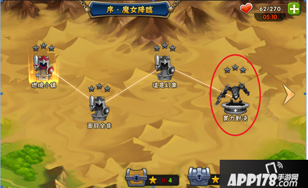 如何在魔女的世界里打怪升级爆装备呢?点击主城中战役按钮自动寻路进入副本。进入战役后显示我们副本的每个据点,副本下的光圈代表当前战役的最高挑战进度,灰色据点我们是无法进入挑战的,只有通关光圈据点才能解锁下一个副本。这里要注意的是副本里的每个BOSS关卡,难度要远远高于普通副本,请玩家一定务必小心不能大意。