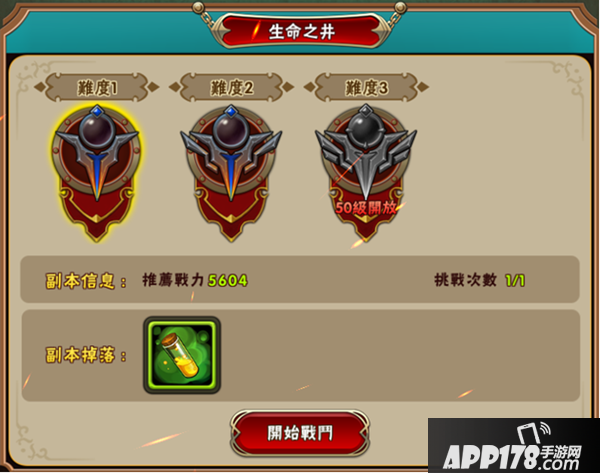 点击试炼进入生命之井,生命之井主要掉落体力药剂,当玩家的体力不足,可以通过使用体力药剂恢复体力来继续战斗,每天有一次挑战次数,如果你体力足够也别忘了来打,每天攒几个也是不错的人物后期有大量需求哦。不同难度对应小中大体力药剂。