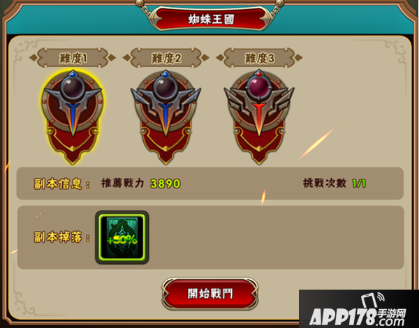点击试炼进入蜘蛛王国,蜘蛛王国掉落不同加成的经验卡,经验卡可在战役中使用获得经验加成,更快提升等级。每天只可挑战一次。