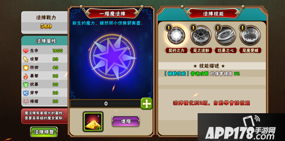 打开法阵界面,就能看到一个最初级的1阶魔法阵,嗯嗯,法阵内散发出的魔力,似乎预示着它所蕴含的无穷无尽的魔法能量哦!虽说是1阶的新生法阵,但已经可以为魔女们提供相当可观的属性加成呢,所以建议各位魔女一有机会就赶紧发动法阵吧!让我们赶紧发动法阵,看看实际效果吧!