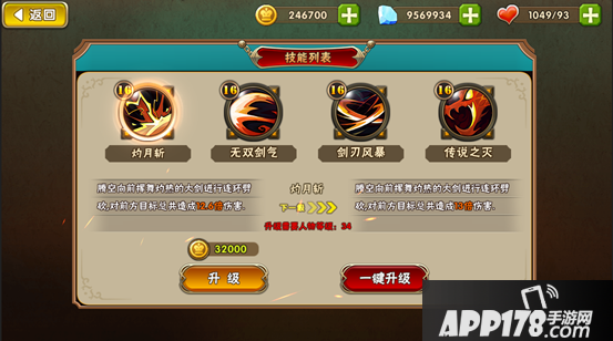 玩家共有四个技能空位,按照游戏中主人公魔女的等级依次解锁,魔女升到一定等级后,可以升级技能,技能可以释放普攻N倍的伤害,因此要及时提升技能等级哦。升级技能只消耗金币,所以大家有金币不要全部拿去抽宝箱了,升级技能也是很重要的。为了把游戏的体验做得更好,本作中增加了一个快速升级的按钮。只要金币足够,如果觉得依次升级技能很麻烦的话,可以直接一键升级哦。