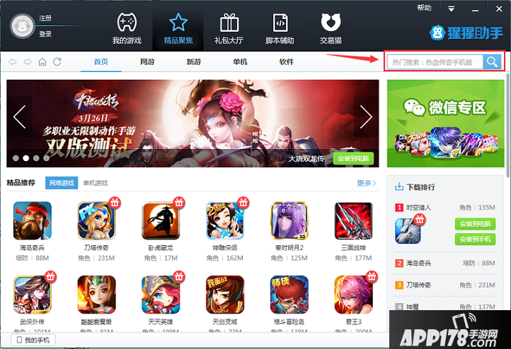 第三步,打开猩猩助手,进入精品聚焦页面,在右上角可以搜索、查看更多游戏,收录了最新网游和新游。