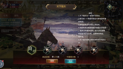 天下强兵是一系列环式挑战,玩家进入游戏、完成新手引导便可开启挑战。一般来说,各位主公每天可开启二十次挑战。挑战分为简单、普通、困难、地狱以及史诗等难度,每完成一个难度的挑战即可解锁更高难度,高难度挑战的环数上限也更高。以简单模式为例,在此模式下各位主公将挑战的是各等级的强盗,正所谓邪不胜正,相信在各位的神机妙算之下,这些散兵游勇定会丢盔弃甲,落荒而逃。