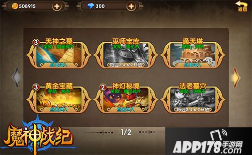 在《魔神战纪》中,历练内含:天神之墓、巫师宝库、通天塔、黄金宝藏、神灯秘境、法老墓穴、勇者试炼、四十大盗、保卫国王、守护神之战等多种玩法。