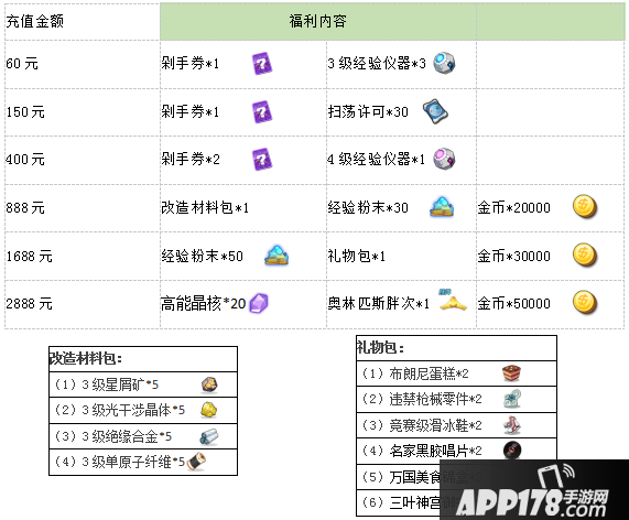 活动详情:活动期间累计充值达到60/150/400/888/1688/2888元时,即可领取对应奖励。