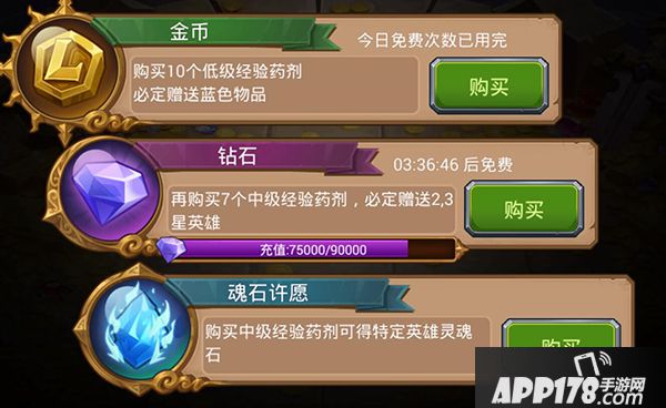 游戏中的核心氪金点在于利用钻石购买英雄,整体购买方式分为金币以及钻石两种,而钻石购买又可细分为直接钻石购买和魂石许愿两种。而玩家们初期的选择多是积攒出2000钻一次性购买8个,这样的好处在于必出一个高星完整英雄,对于初期玩家提升战力非常有帮助,但是就长远来说,2000钻购买会出现很多不必要的符石、经验药或换取金钱的商品,这些物品能够通过扫荡地图获得,利用钻石购买并不划算。