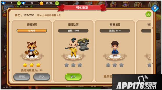 从每日必玩入口选择强化密室就可以进入副本界面后,需要从密室一层开始挑战,每次密室挑战需要销量主角精力值,每10秒小号1点精力值,精力值每6分钟可以自动恢复一点,恢复到100点后就达到上限啦~通过前面的密室后,才可以开启后面的密室哦~在规定时间内通关密室,可以获得相对应的星星评分,对应的奖励也不同哦~当星星评级为三颗星时,可以委托通关。委托消耗精力按照历史三星通关的最小消耗值计算。
