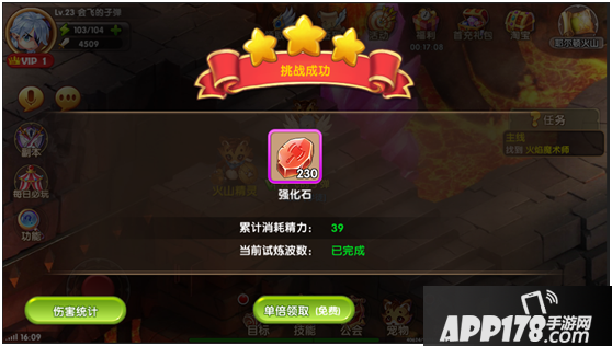 喏,挑战成功后就有大量的强化石道具获得,现在,你可以拿这些强化石去强化你的装备,提高战斗力啦!
