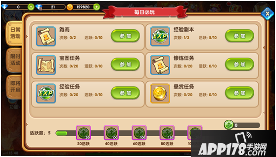 小伙伴们等级达到21级完成主线任务后就可以开启每日必玩功能啦,里面有丰富的任务系统等待小伙伴们去参加,随着等级的提高后续还会增加更多的日常任务喔,这样小编终于可以解脱了,可以选择自己喜欢的任务去参加了,而不是枯燥的副本、副本、还是副本啦!