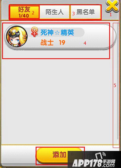 1、 标题栏:标题为“好友”“陌生人”“黑名单”,右侧是关闭按钮