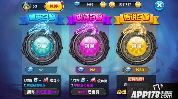 关于祭坛召唤需要注意的一点是,关于史诗召唤和极品占星,我建议使用每天免费赠送的次数,而不要使用钻石去抽奖。而钻石我们则留给10连抽。如果你不打算10连抽的话,那么慢慢存碎片换成宠物也是可以的,但是速度会比较慢。