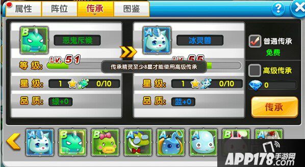 首先是30级开启此功能,其次精灵传承简单的说就是将A精灵的等级、星级、品质传给B精灵,A精灵等级、星级、品质回到初始,B精灵得到提升。并且玩家在传承时可以选择普通传承和高级传承(8星传承精灵才可使用),等级、星级、品质具体怎样转化看下面的介绍: