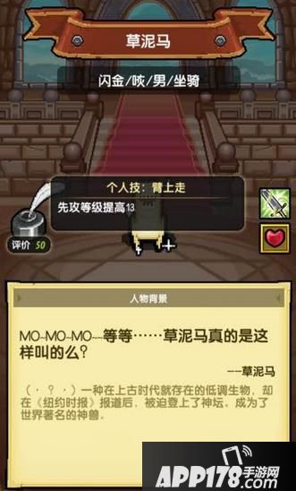 评价:作为神兽,这货的属性成长相当优秀,自带13先攻可以在前期稳定先手。前期抽到必带,后期有更优秀的先攻技能角色可以选择替换。比较有利的竞争者是庞麦郎。两者的先攻一样,庞麦郎多2王者,但草泥马多5闪避,根据计算,1王者的价值等于2闪避,而闪避对回血的加成很高这样的话,堆攻击就是庞麦郎比较好,回血流就是草泥马稍好。