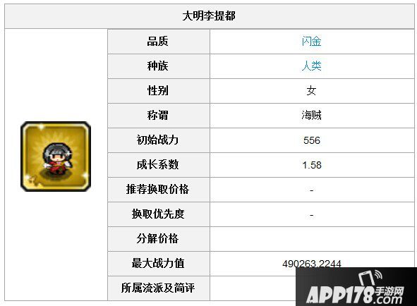 大明李提督是防闪回复流神将,5闪5防属性加成是防闪回复流必备属性,25%几率回复敌方当前战力比较玄妙,可以说是专门针对防闪回复流的神技,在面对其他阵容时作用不大,但是如果敌方阵容是防闪回复,那么这场战斗将毫无悬念。1.58的成长系数在可接受范围之内,宝具属性为0342,与一般金色佣兵无异。唯一的缺点是没有相应的组合技,不过作为单将来说也很不错。