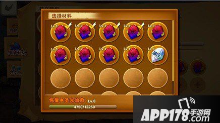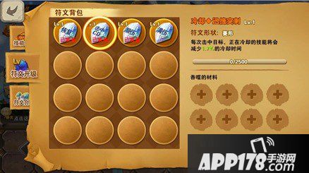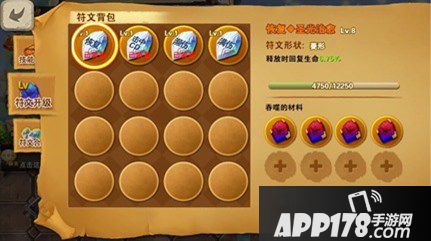 3.在符文升级面板中,选择需要升级的符文,在材料选择区域选择升级用材料,再点击"升级"就可以对该符文进行升级!