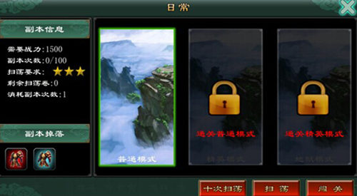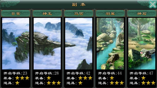 副本分为5个,日常(装备产出),神玉(上古神玉,灵珠),马匹(神兽精魄),羽翼(羽翼碎片),神石(五彩神石,灵珠)。日常副本产出装备主要有绿色以及蓝装,如果在装备精炼上有需求的玩家们通过副本产出装备相比宝箱产出会相对划算一些。