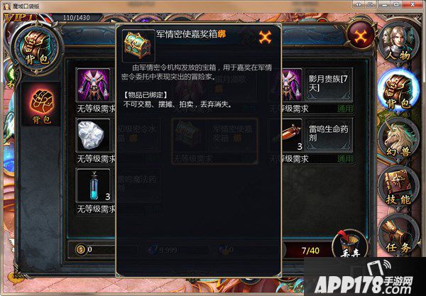 军情密使嘉奖箱是由军情密令机构所派发的绝密宝箱,用于嘉奖在军情密令委托中表现突出的冒险家,开启该宝箱时可从月光宝盒、灵魂晶石、秘宝之盒、精力果等礼物中随机获取其一作为嘉奖!嘉奖箱与密令经验石将会通过邮件方式派发。