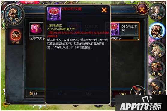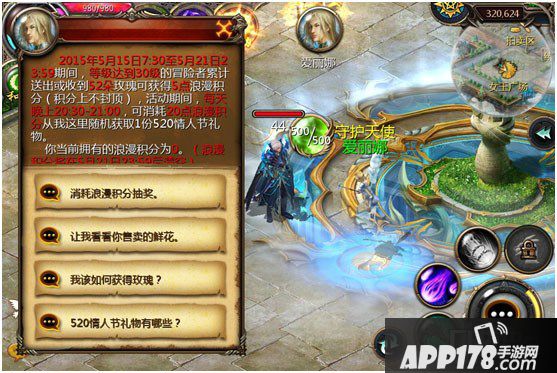 4、【活动3】爱之交响曲——浪漫大抽奖:活动期间,等级达到30级的冒险者累计送出或收到52朵玫瑰可获得5点浪漫积分。每天晚上20:30-21:00,前往守护天使爱丽娜处每消耗20点浪漫积分可获取1份520网络情人节礼物。